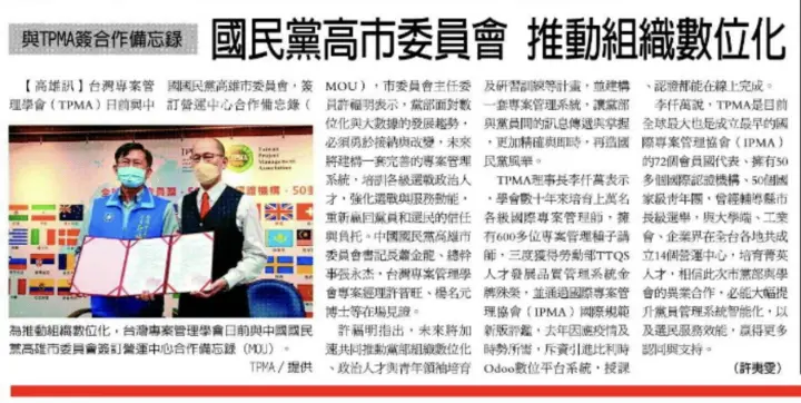 推動組織數位化 國民黨高市委員會與台灣專案管理學會簽訂合作備忘錄