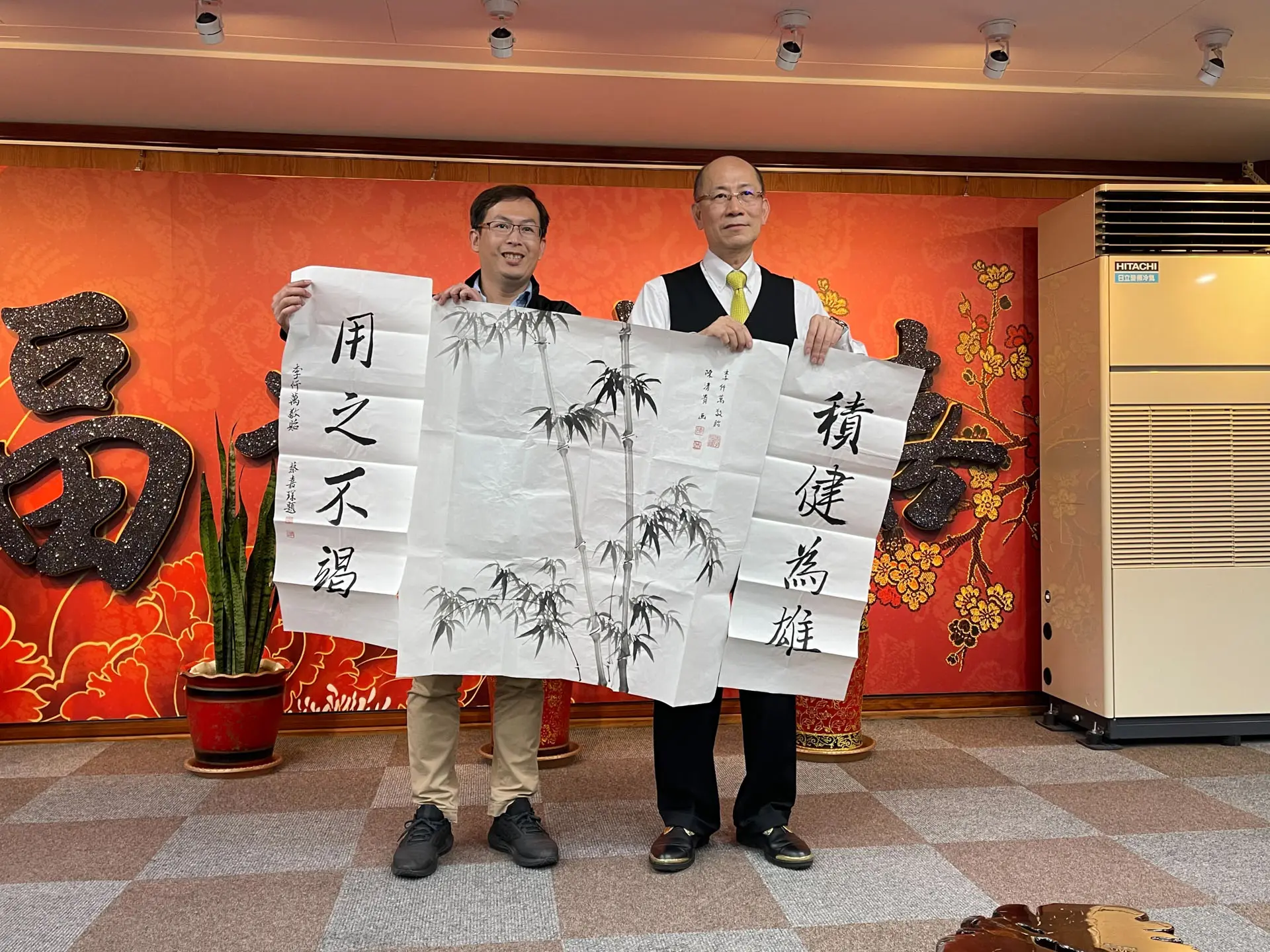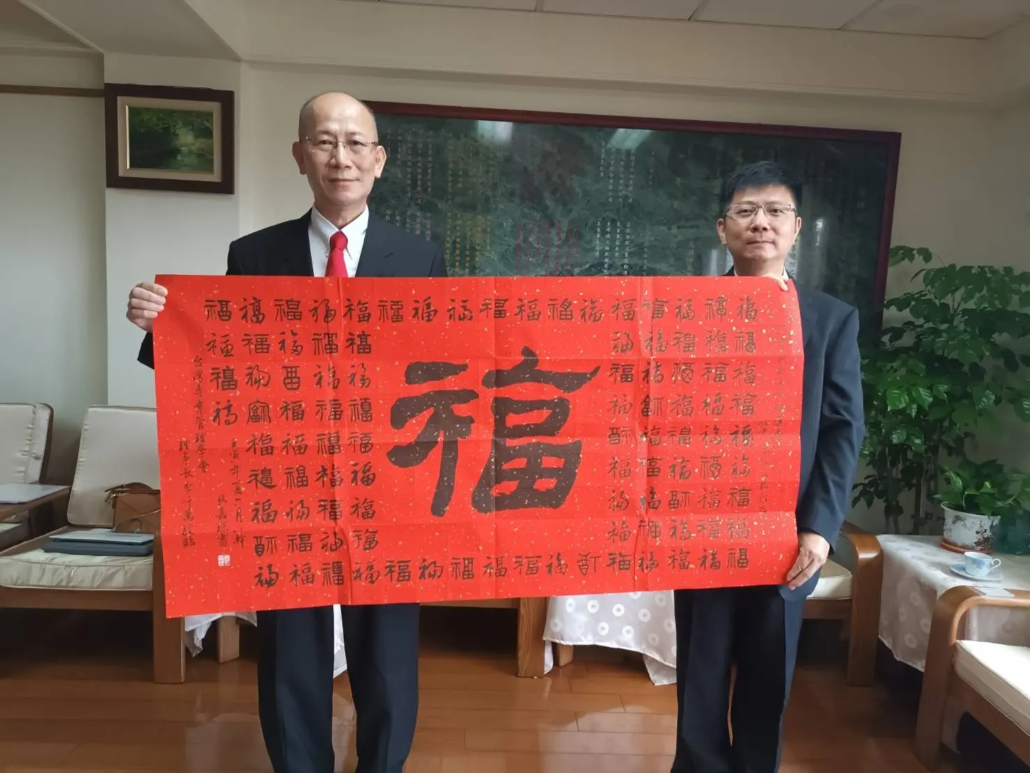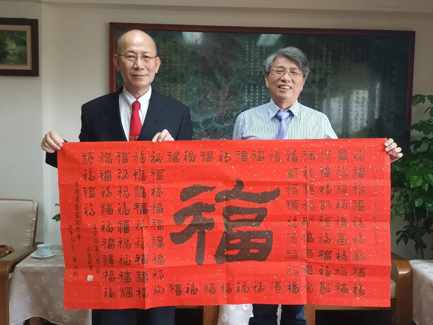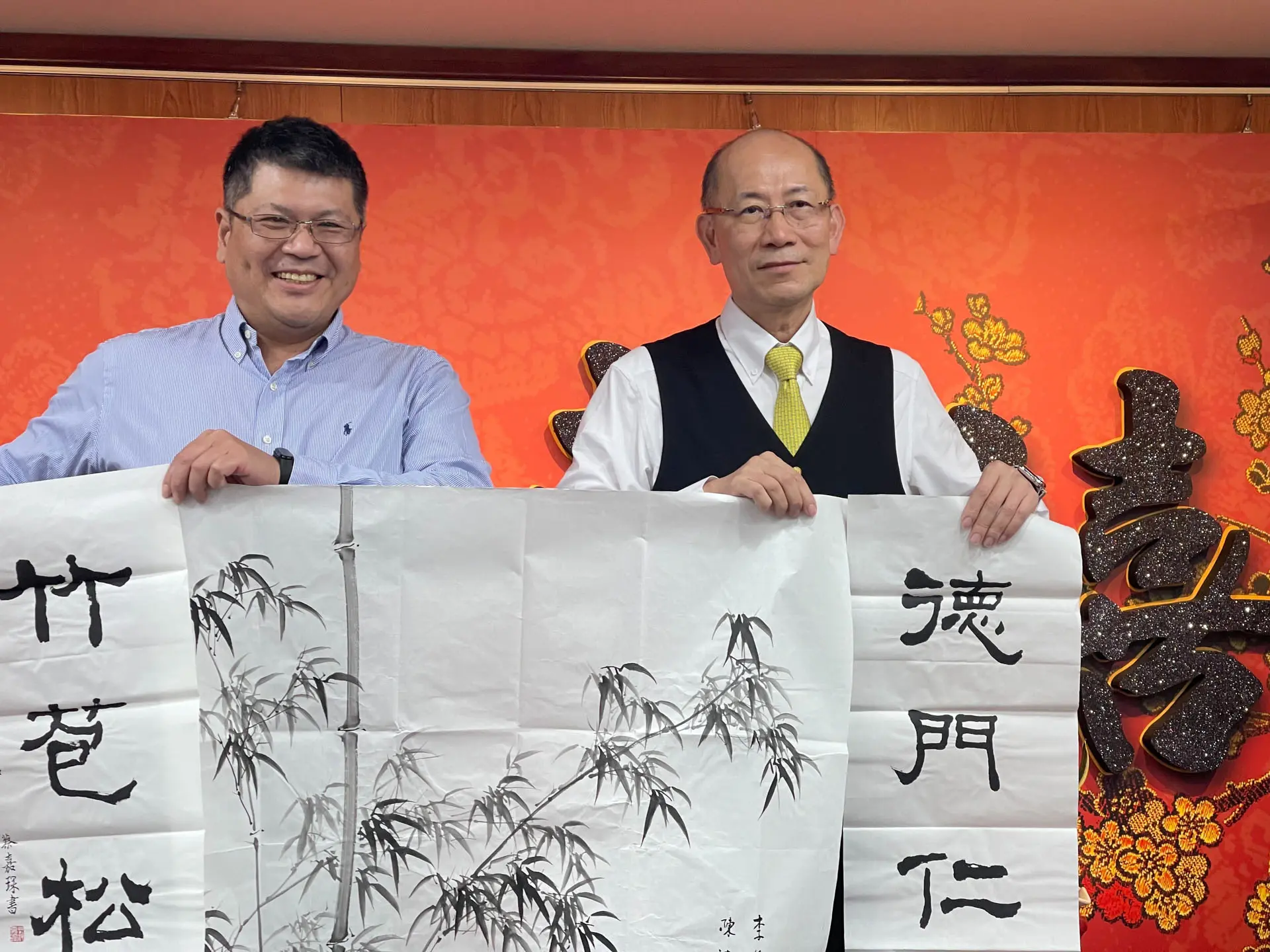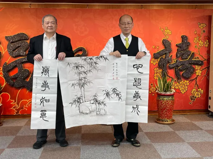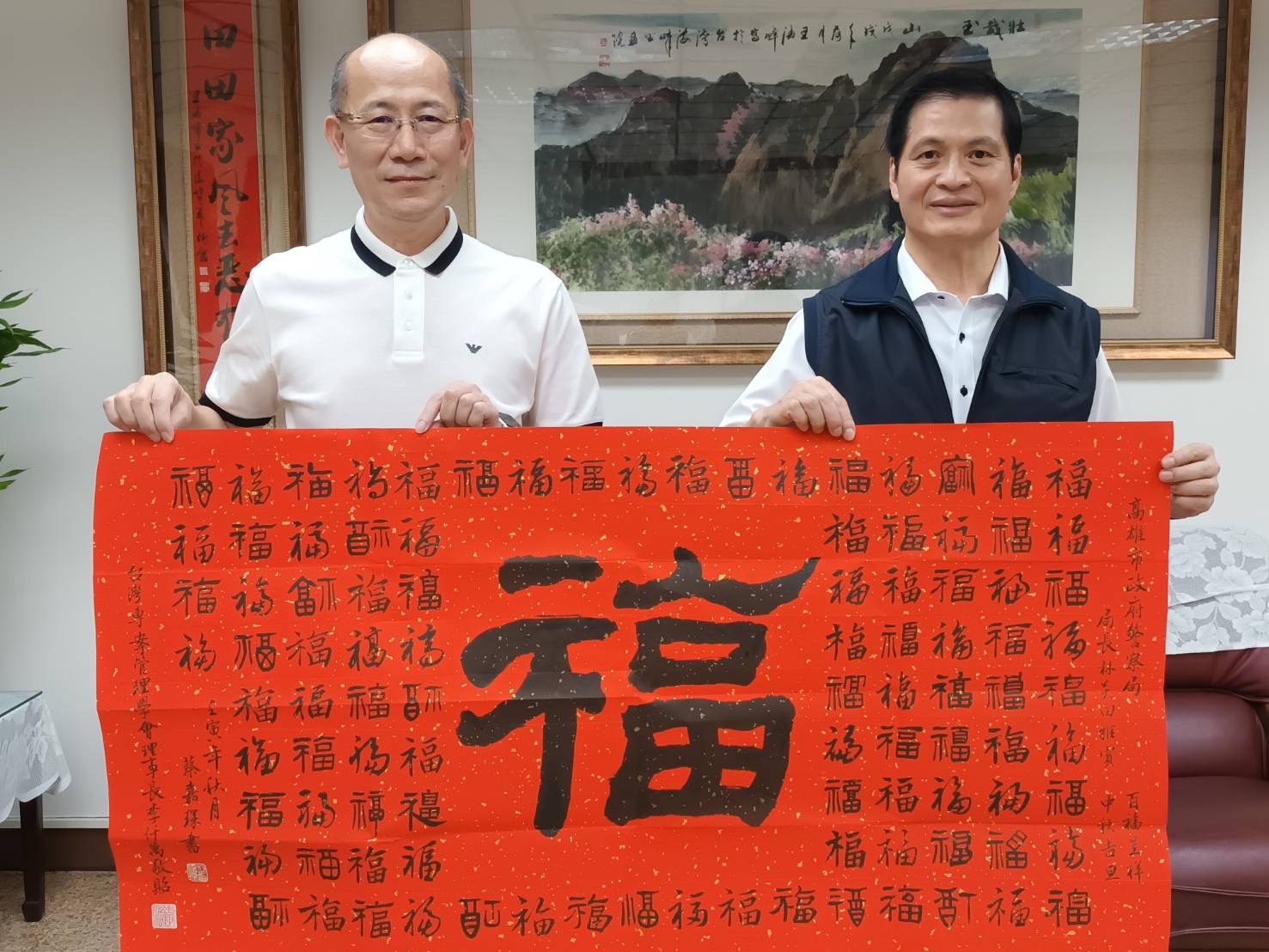 TPMA 理事長李仟萬 先生 致贈陳清貴老師墨竹予高雄市政府 陳其邁市長祝福市民平平安安幸幸福福,並進行多元交流及合影留念。