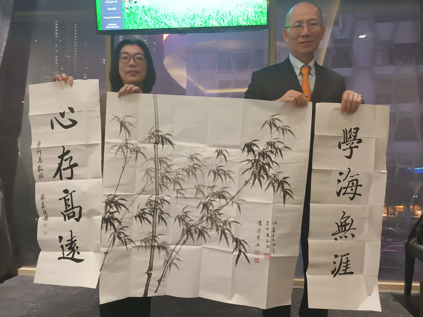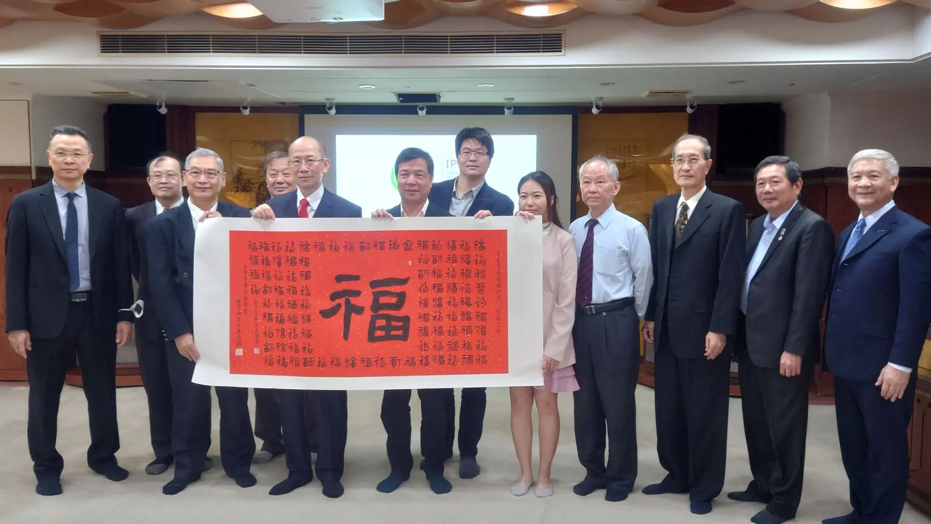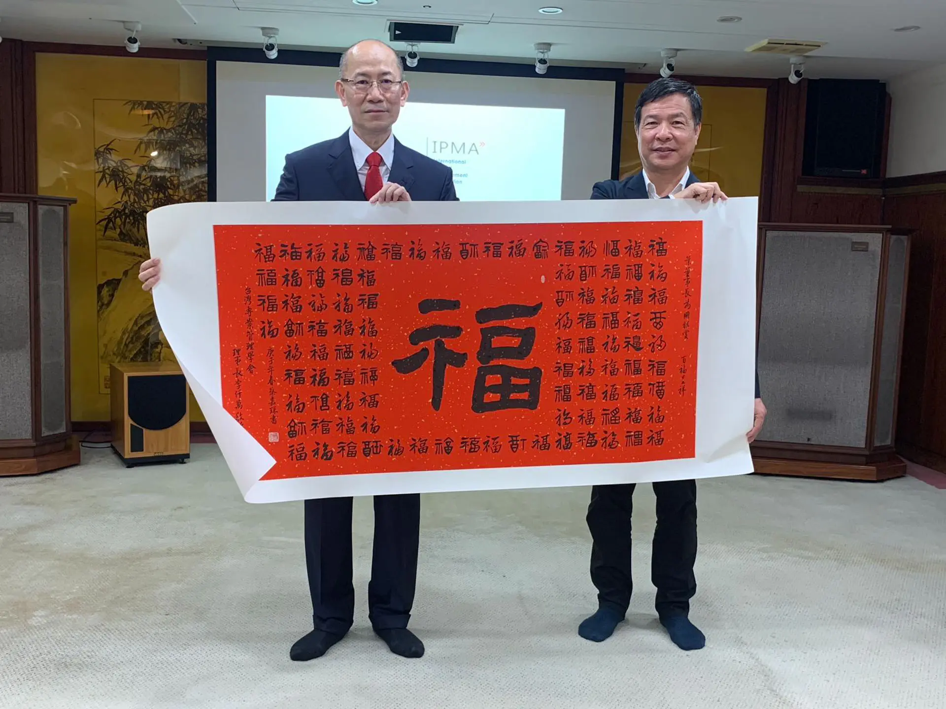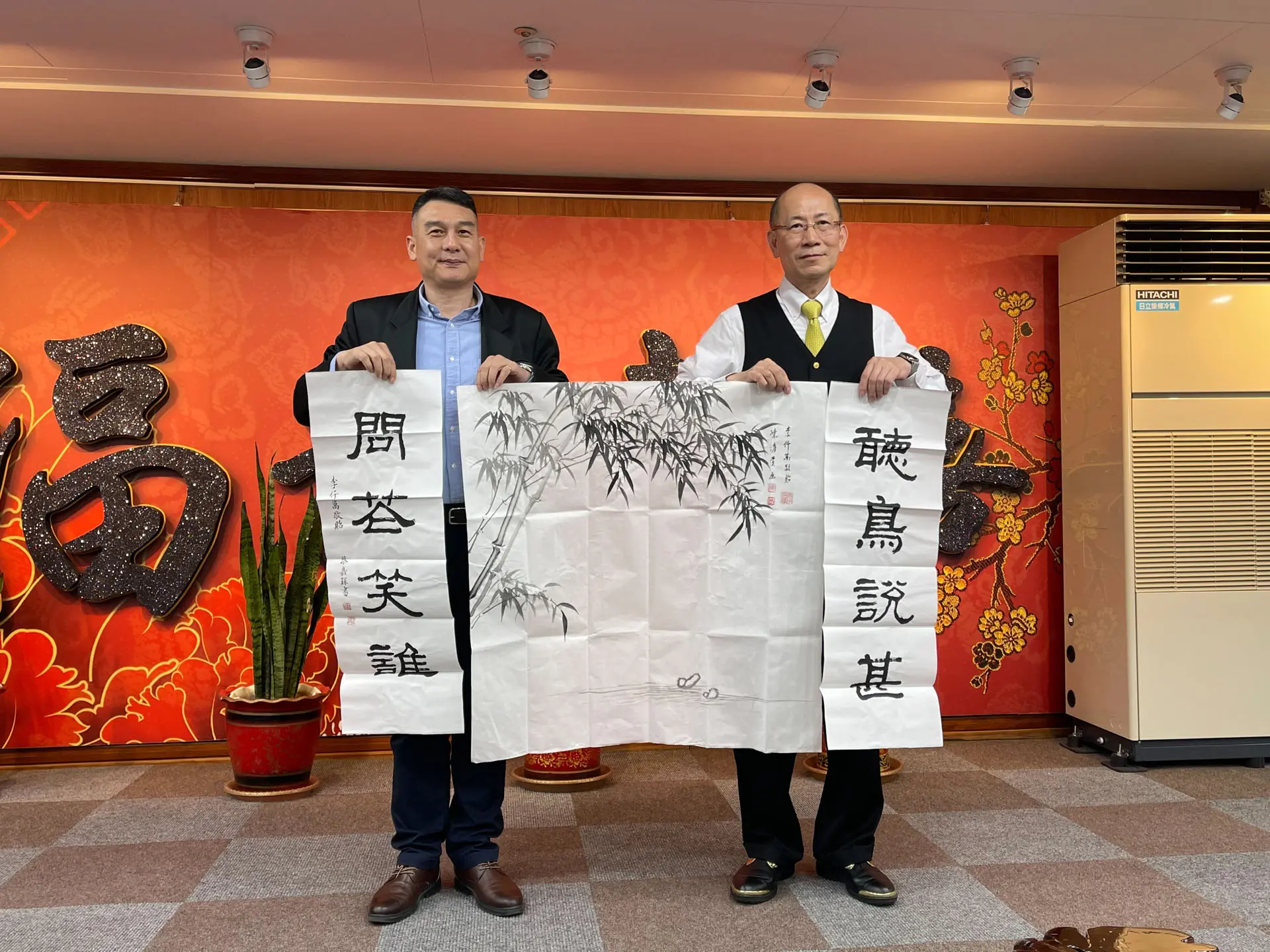 TPMA 理事長李仟萬 先生 致贈陳清貴老師墨竹予高雄市政府 陳其邁市長祝福市民平平安安幸幸福福,並進行多元交流及合影留念。