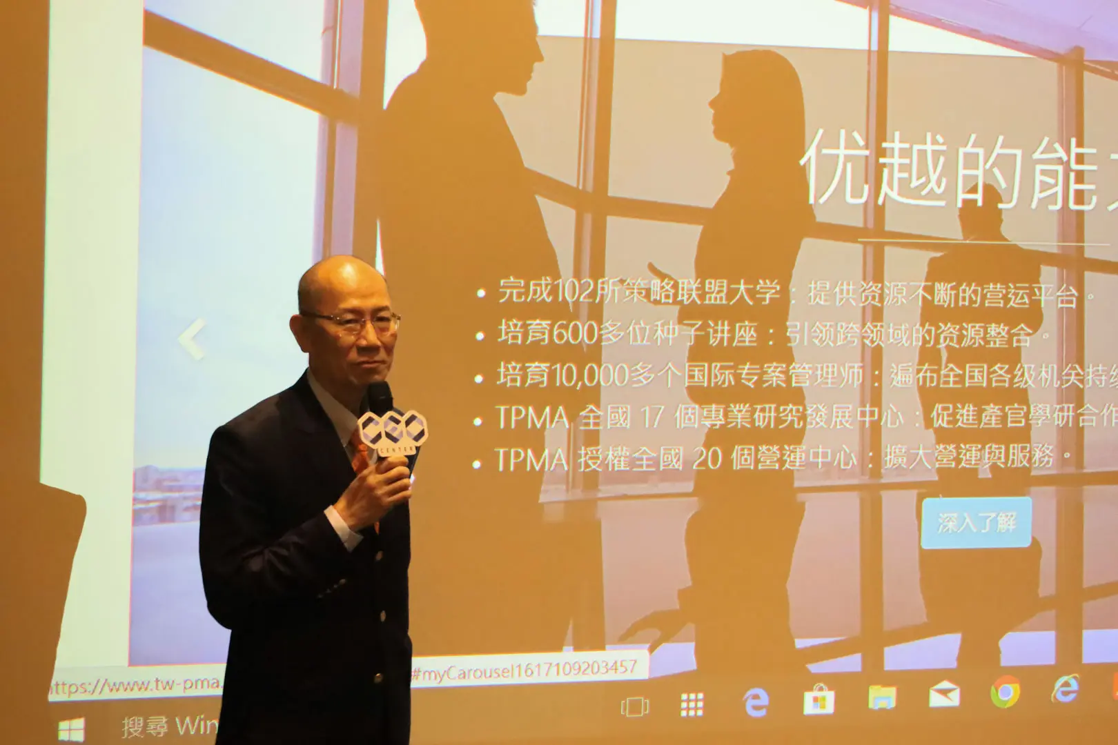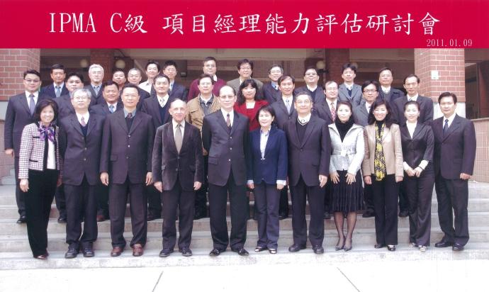 2011年1月9日 TPMA 理事長李仟萬 先生生與 IPMA Dr.Hans 主席、薛岩 副主席及IPMA C級專案經理能力評估研討會學員全體合影。