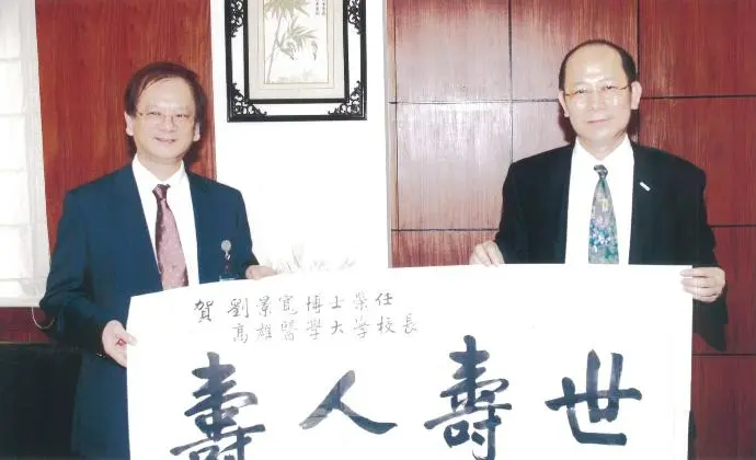 2012年9月20日 TPMA 理事長李仟萬 先生致贈「壽人壽世」墨寶予高雄醫學大學校長 劉景寬博士並進行多元交流及合影留念。