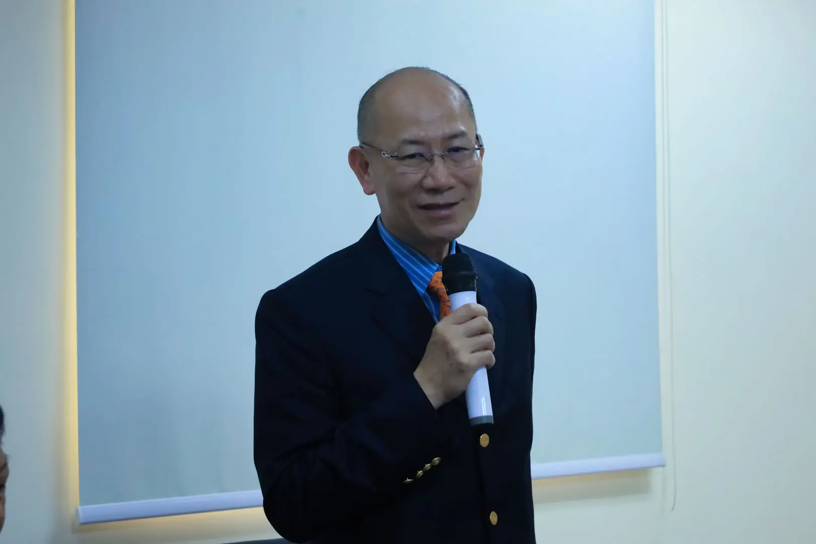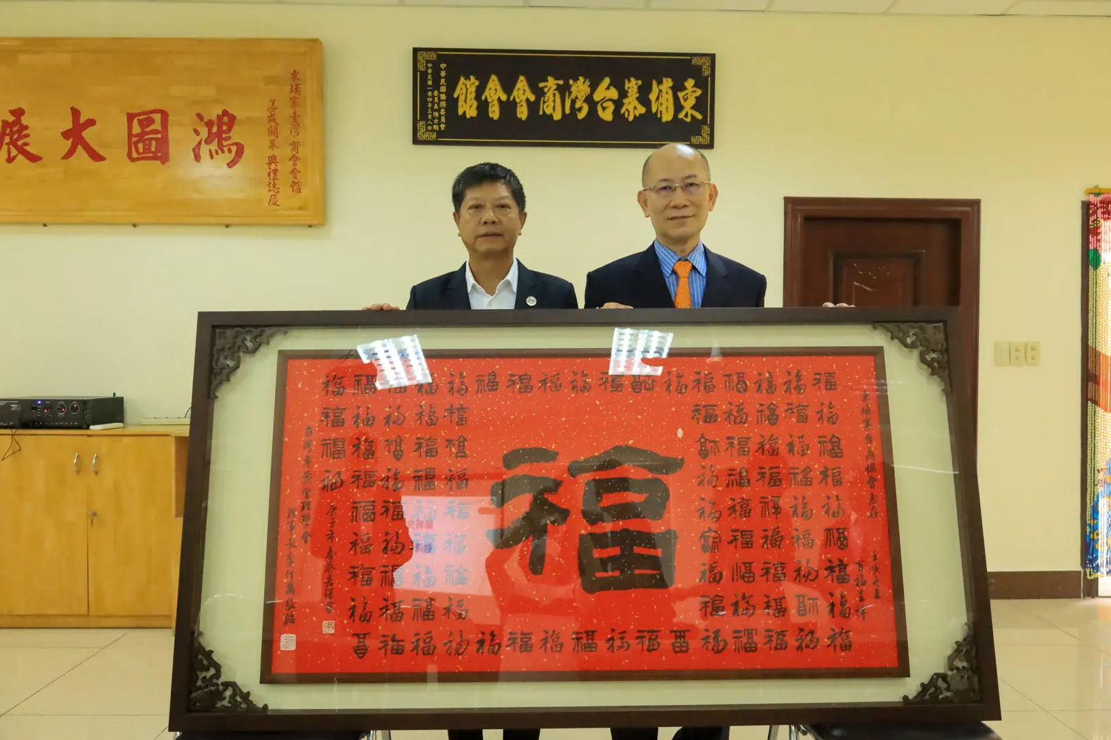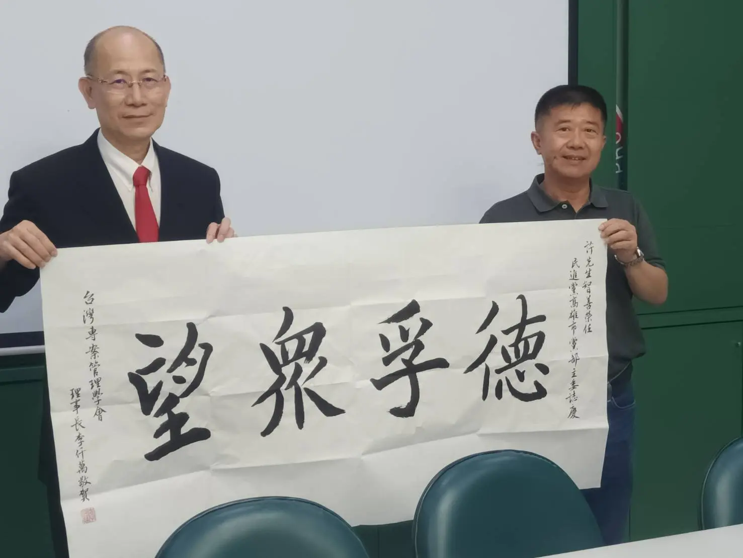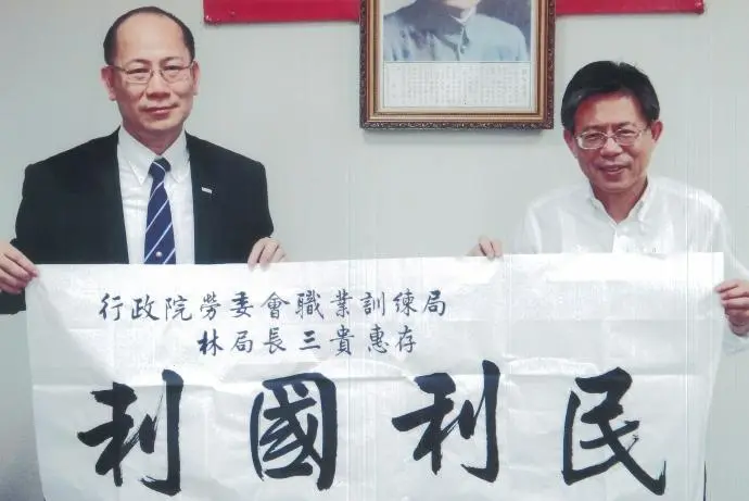 2012年4月25日 TPMA 理事長李仟萬 先生致贈「利國利民」橫幅乙幅予勞委會職業訓連局局長 林三貴 先生並進行多元交流及合影留念。