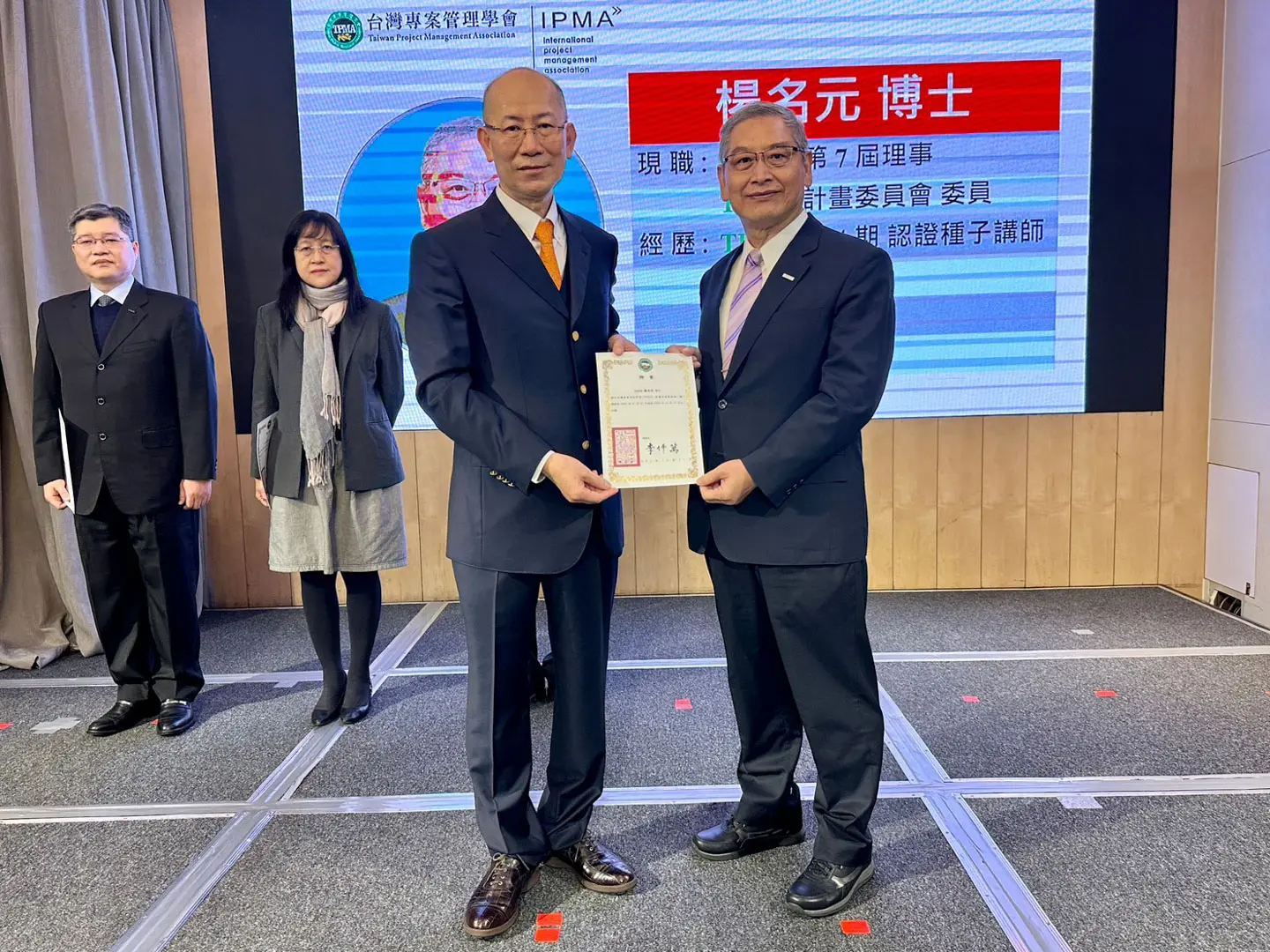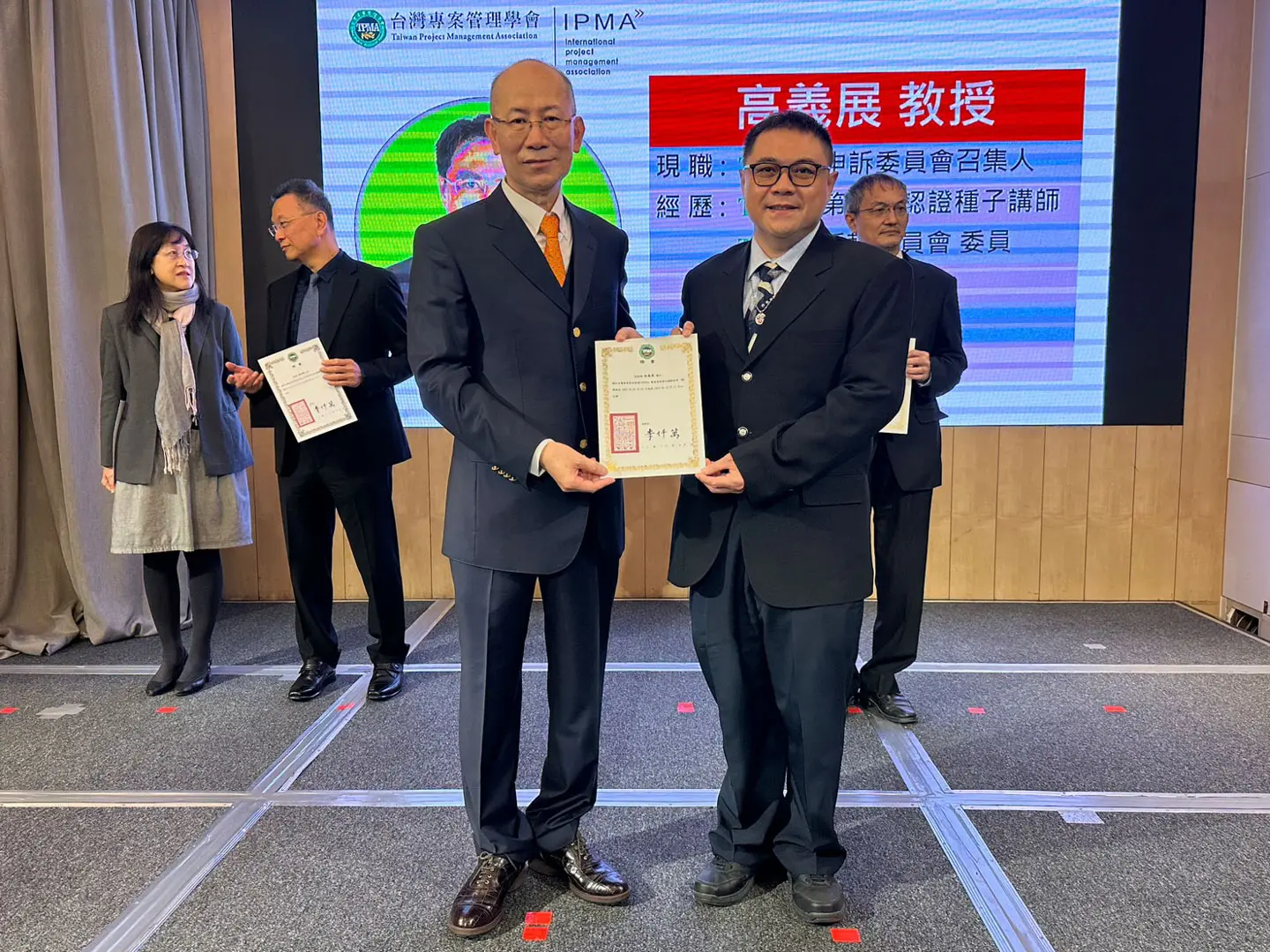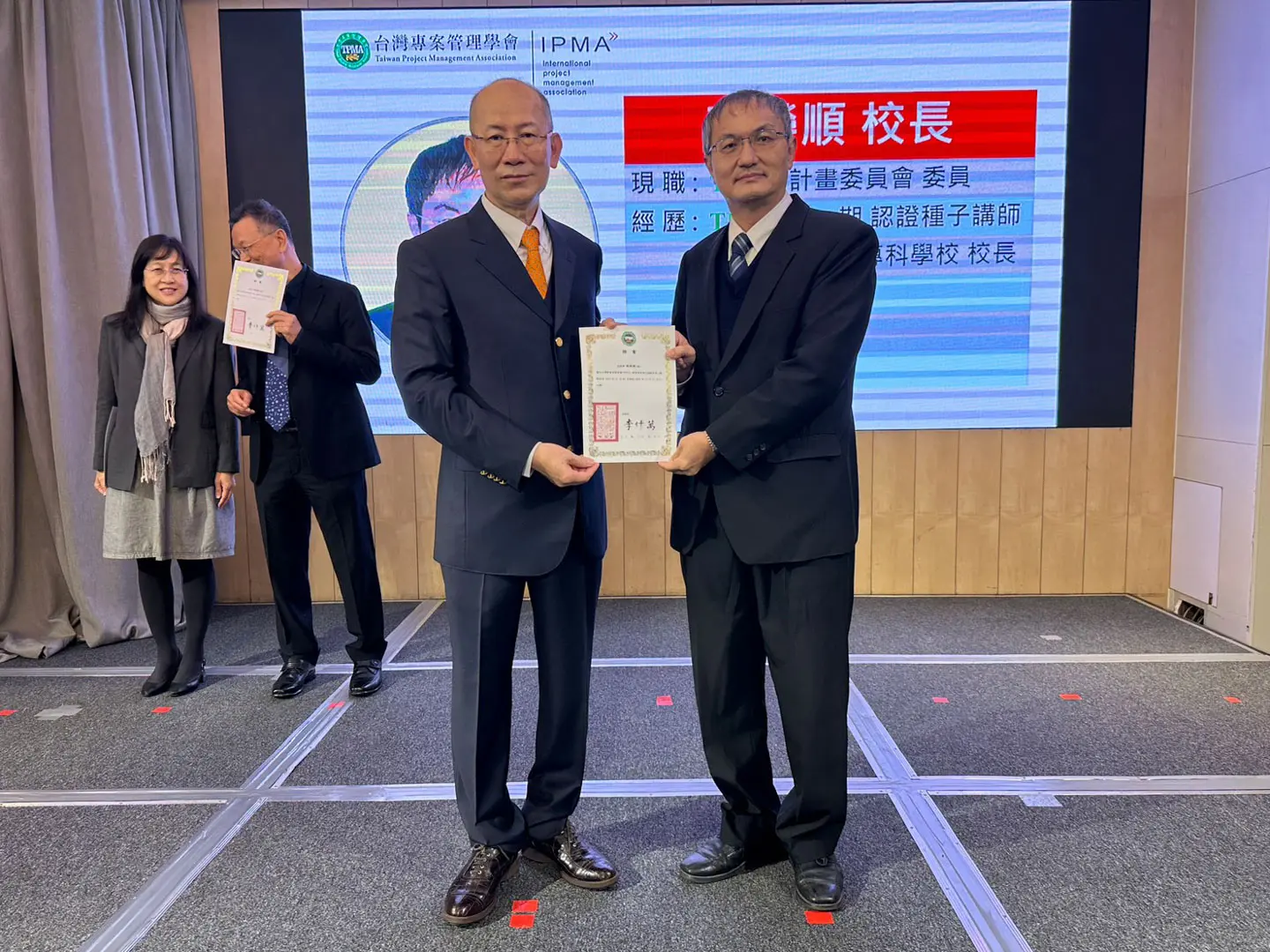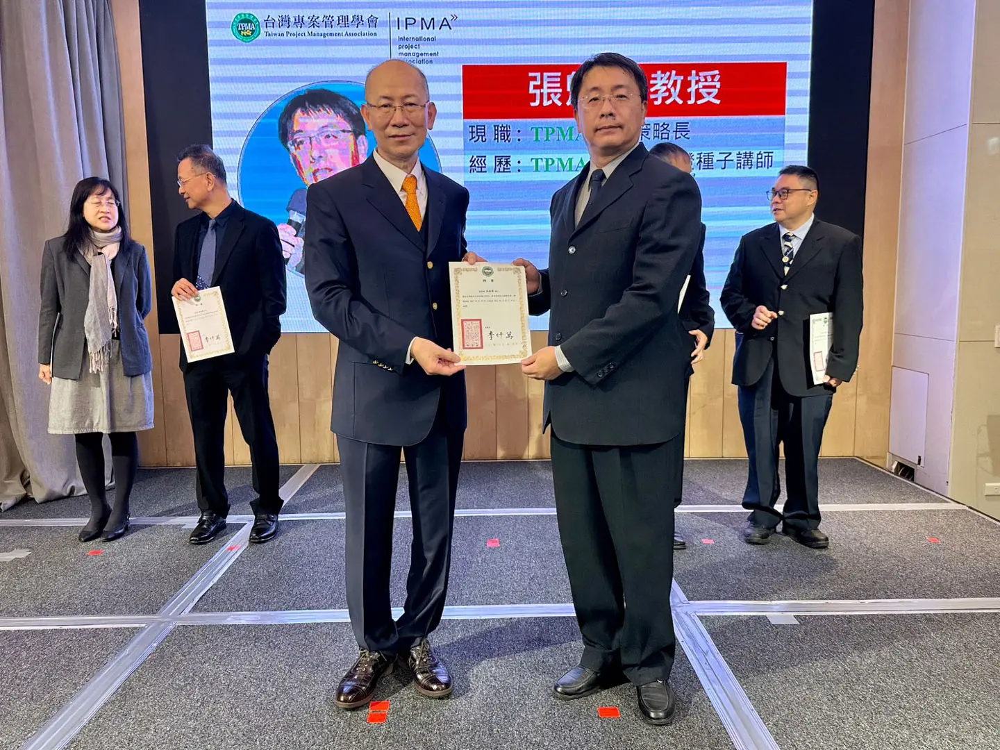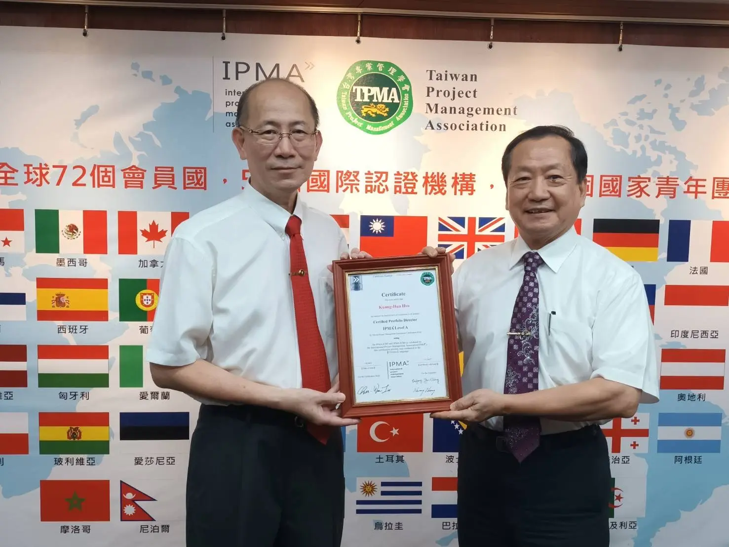 2022年7月20日 TPMA 理事長李仟萬 先生親自授予 IPMA Level A 級證書予許光華校長,並與學會同仁合影留念。