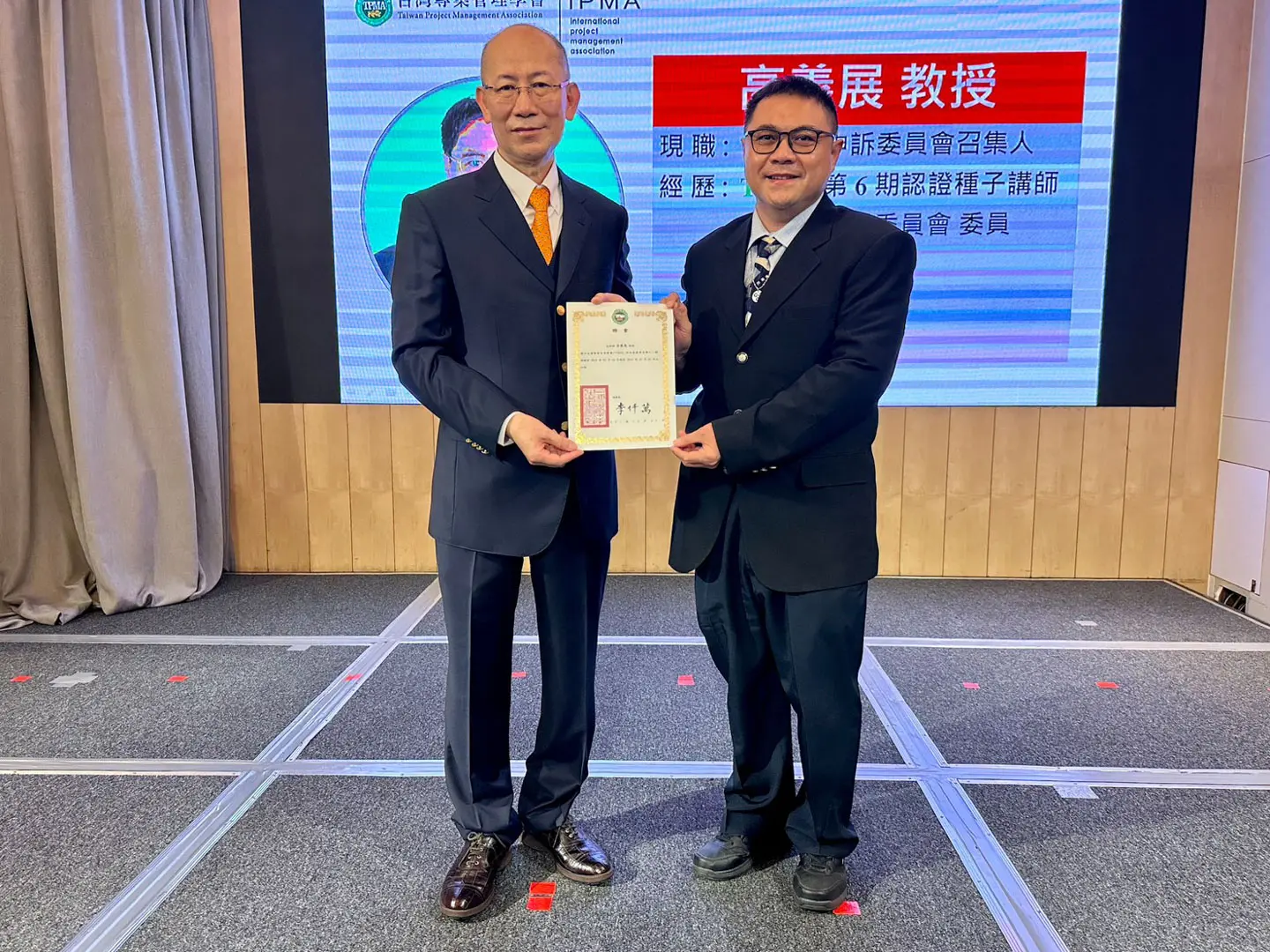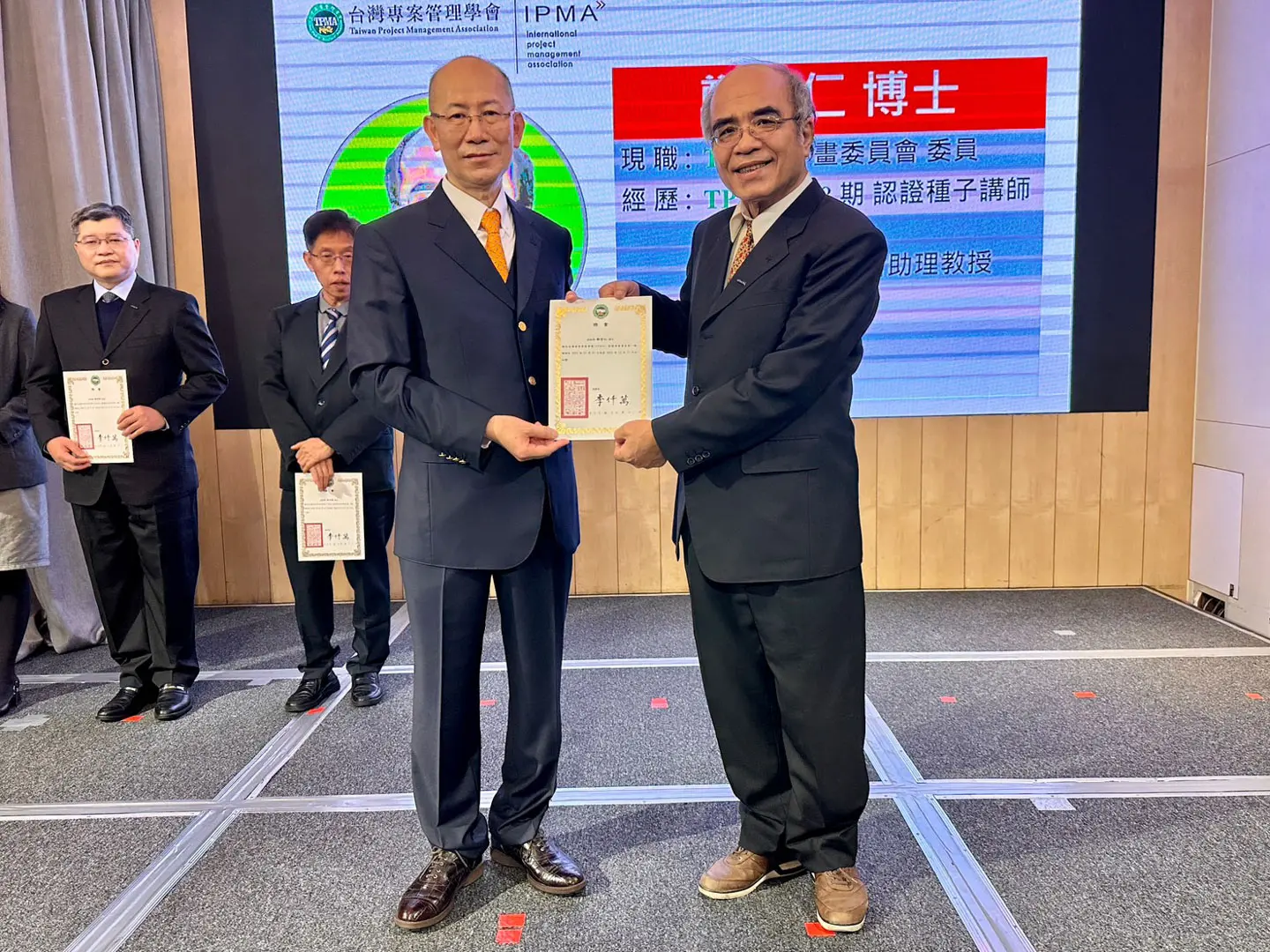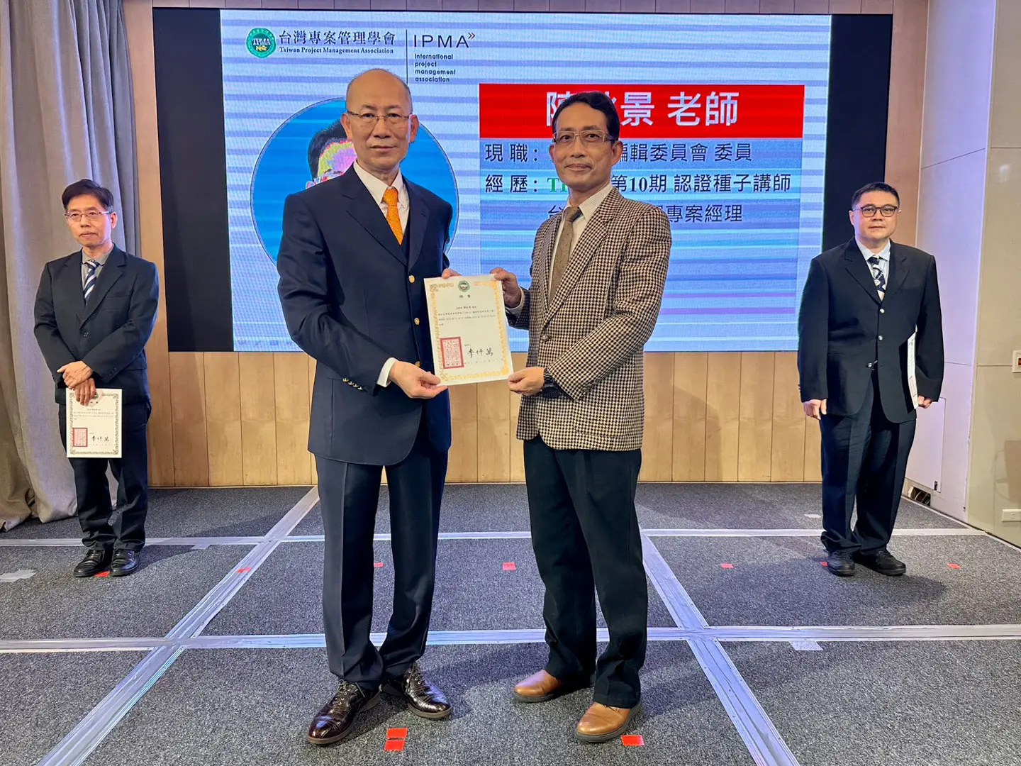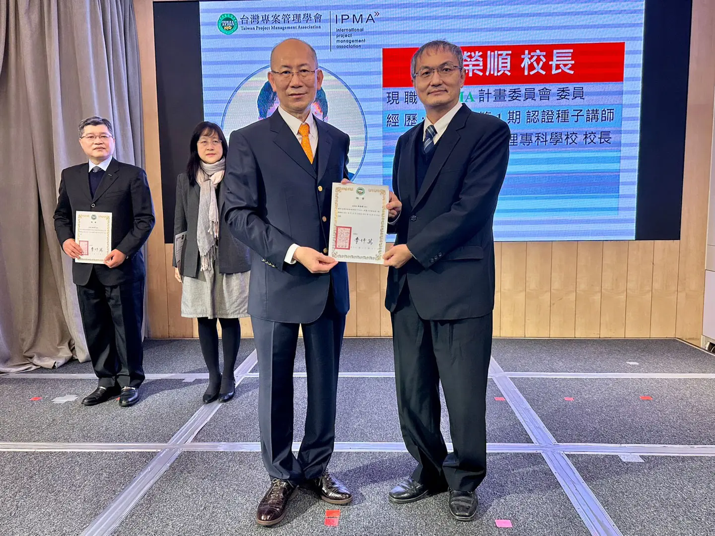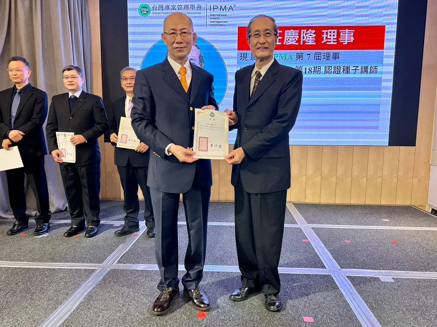 2022年7月20日 TPMA 理事長李仟萬 先生親自授予 IPMA Level A 級證書予許光華校長,並與學會同仁合影留念。