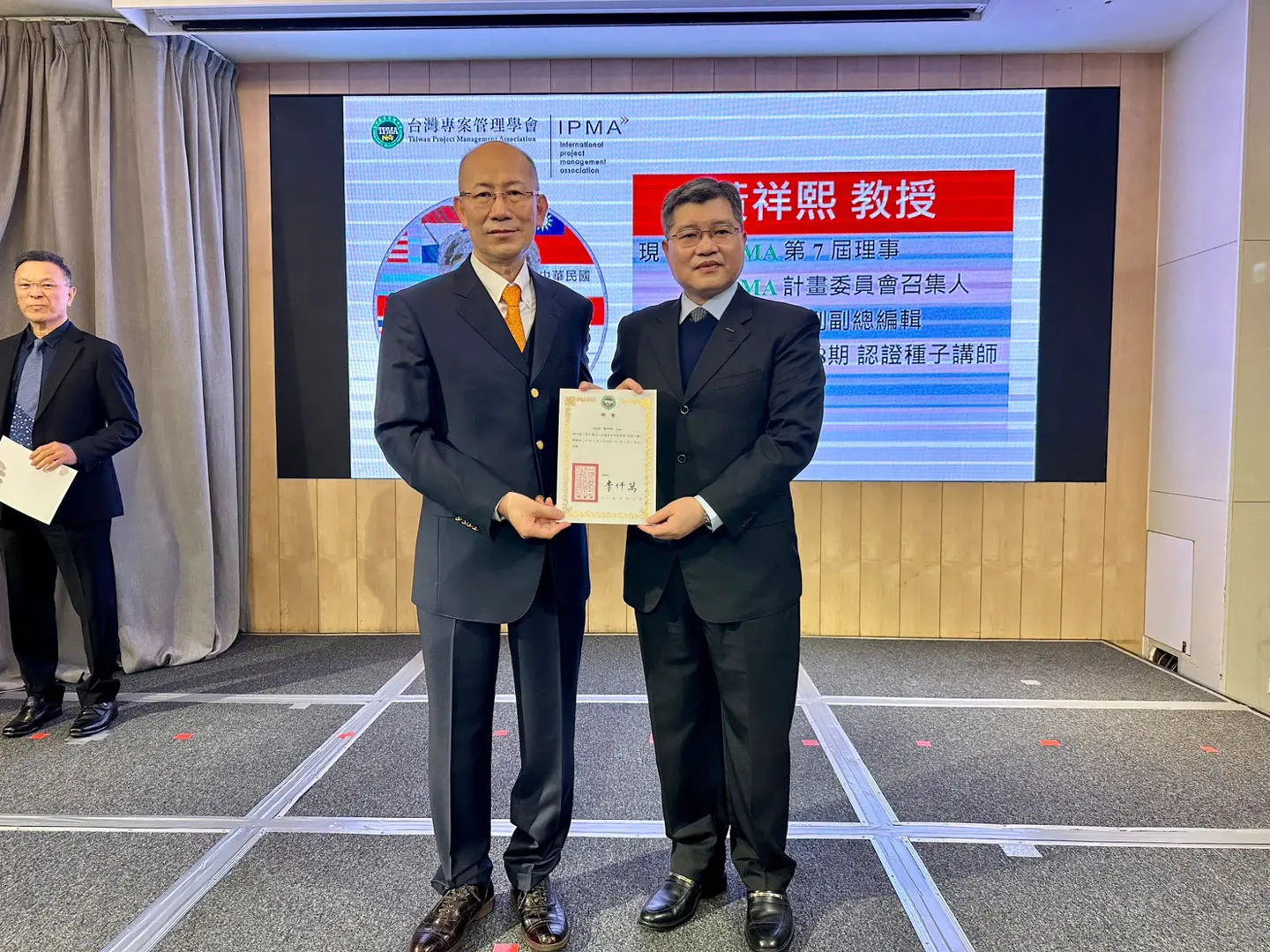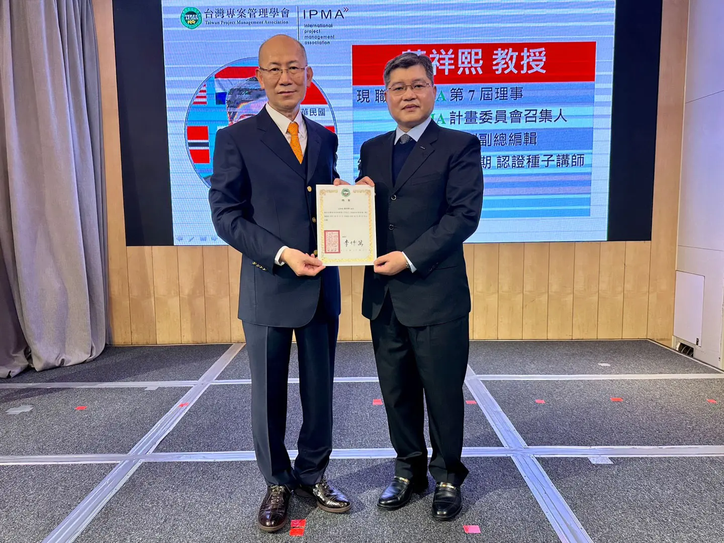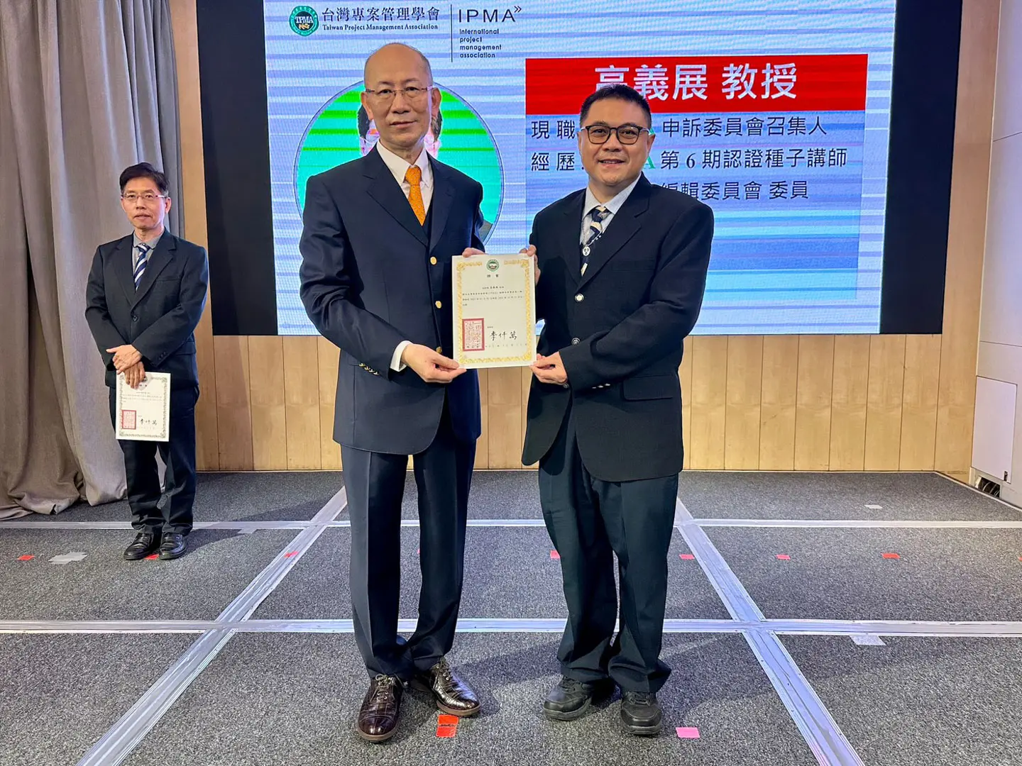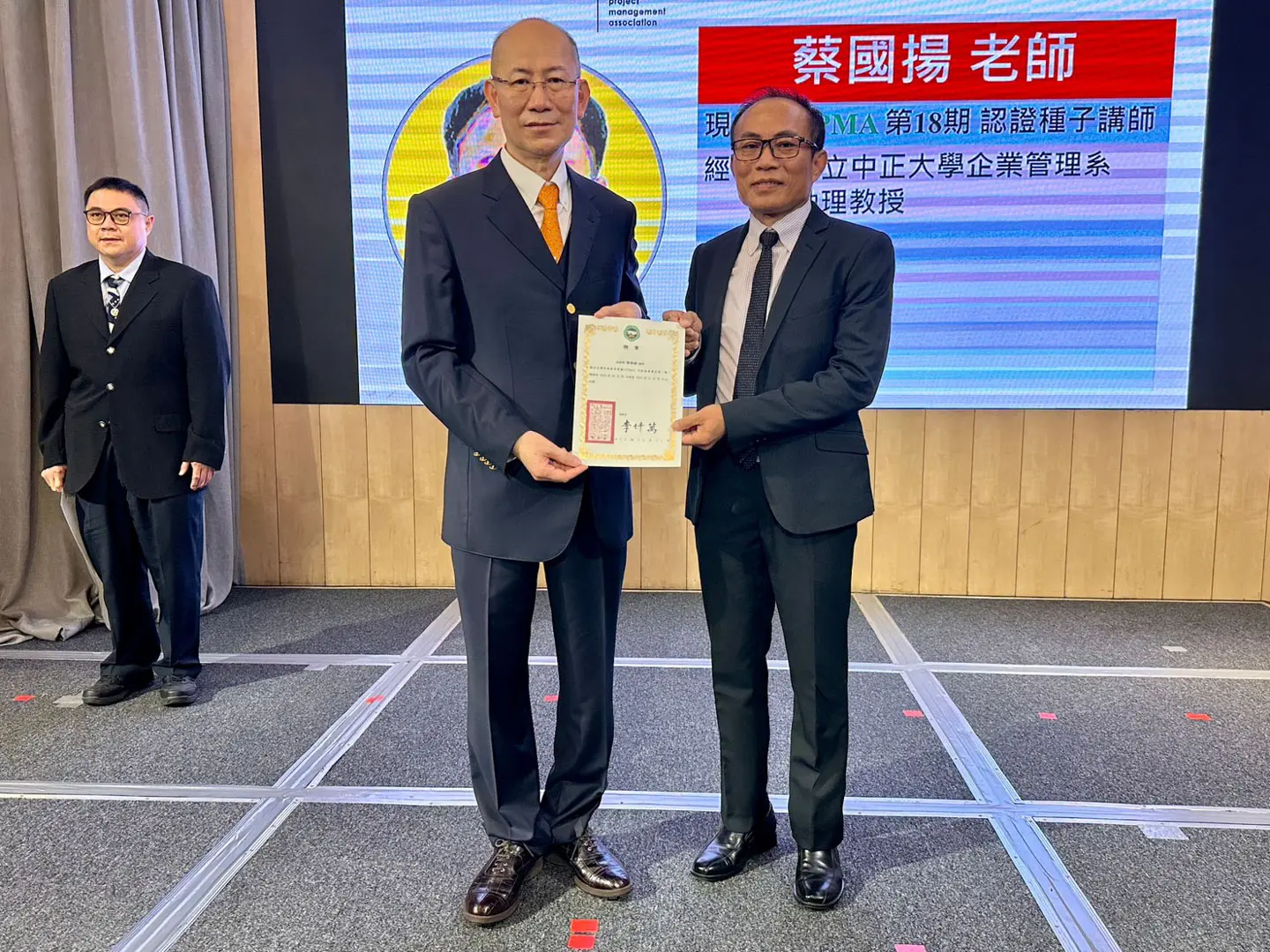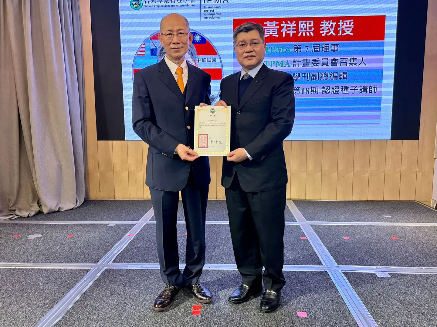 2022年7月20日 TPMA 理事長李仟萬 先生親自授予 IPMA Level A 級證書予許光華校長,並與學會同仁合影留念。
