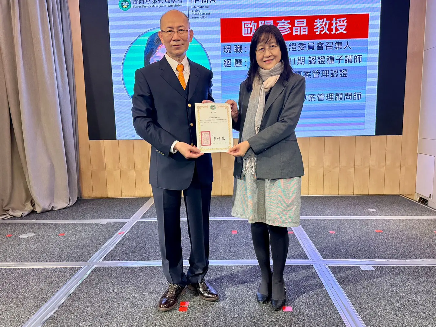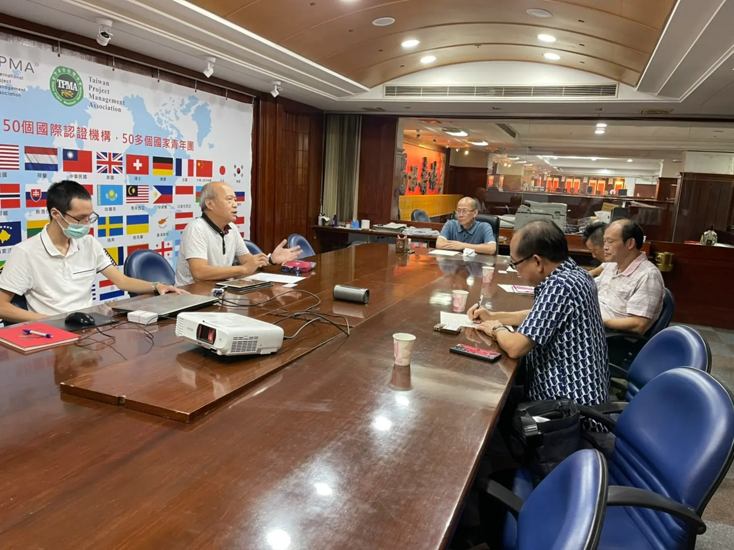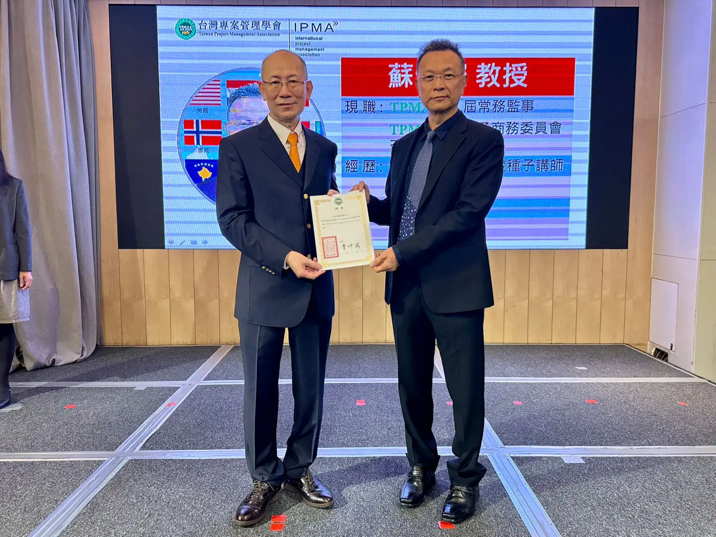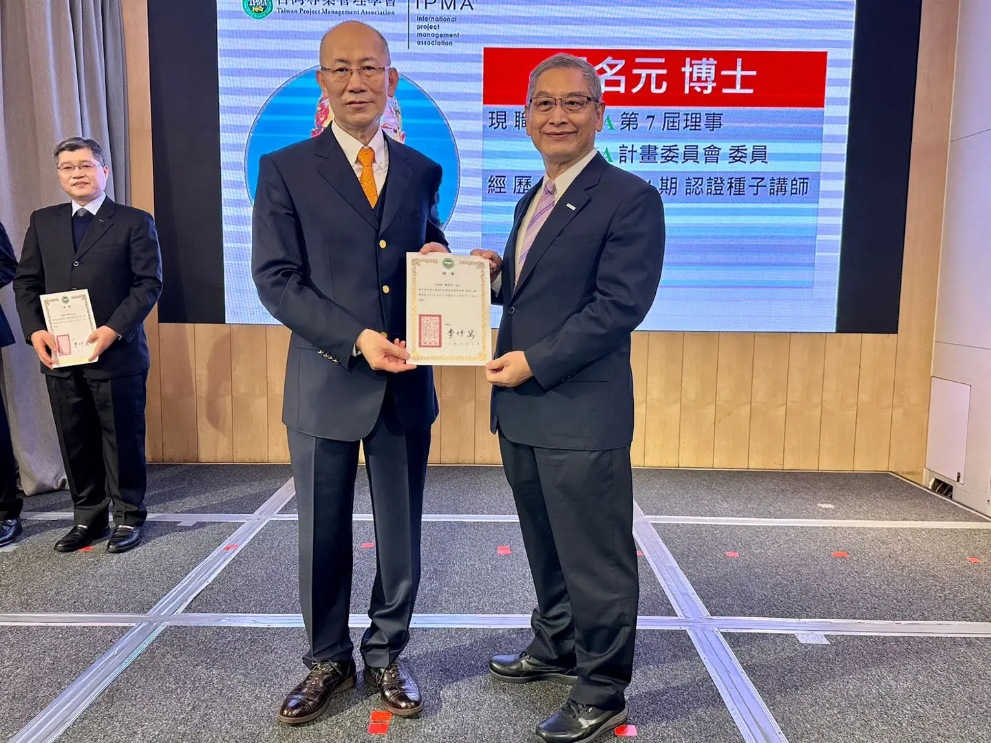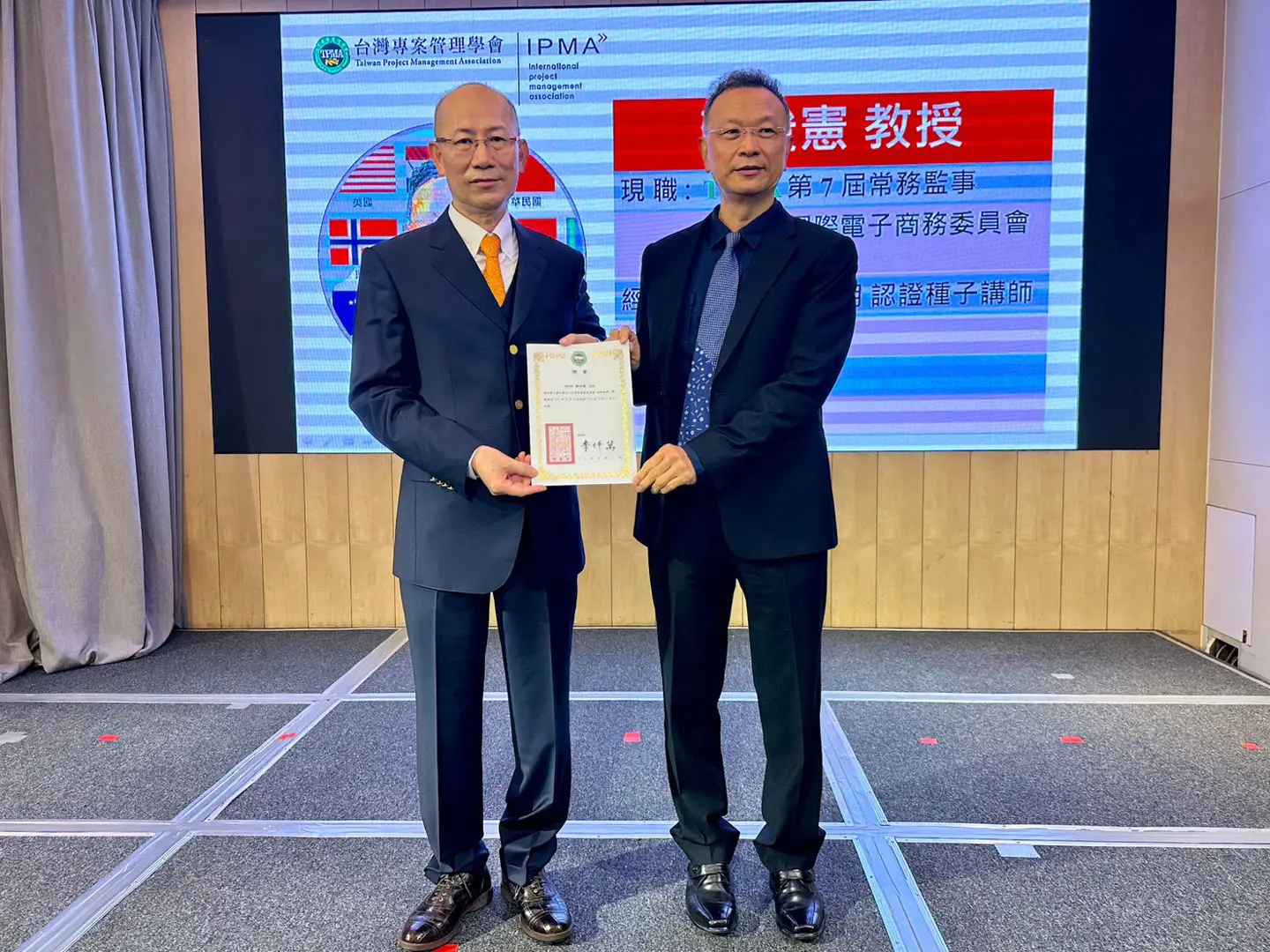 2022年7月20日 TPMA 理事長李仟萬 先生親自授予 IPMA Level A 級證書予許光華校長,並與學會同仁合影留念。