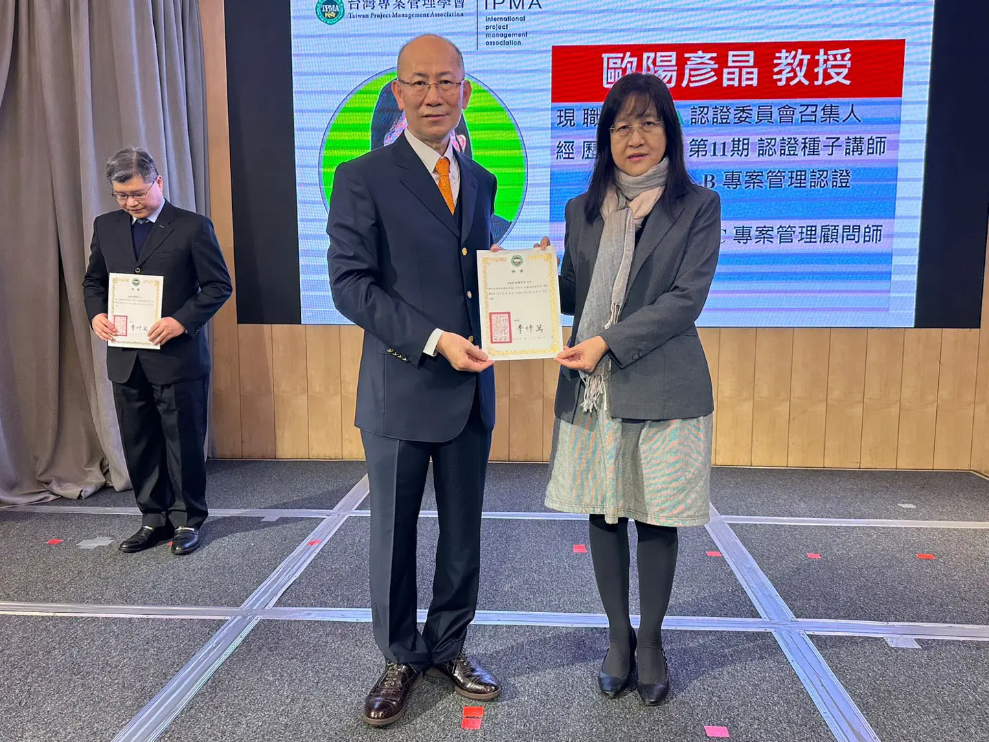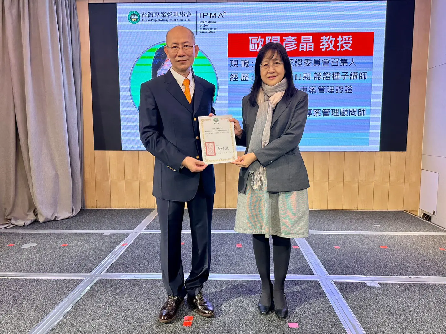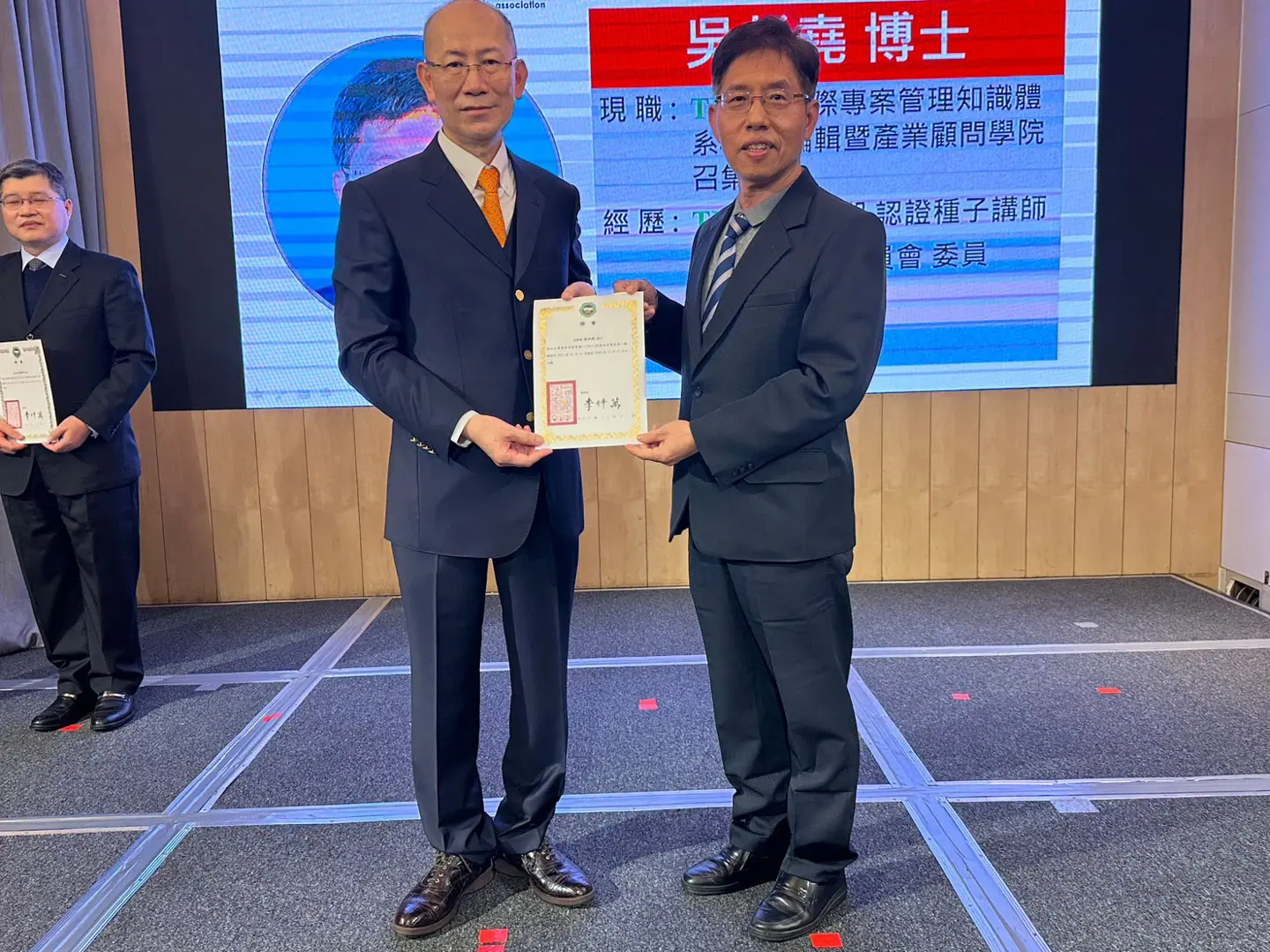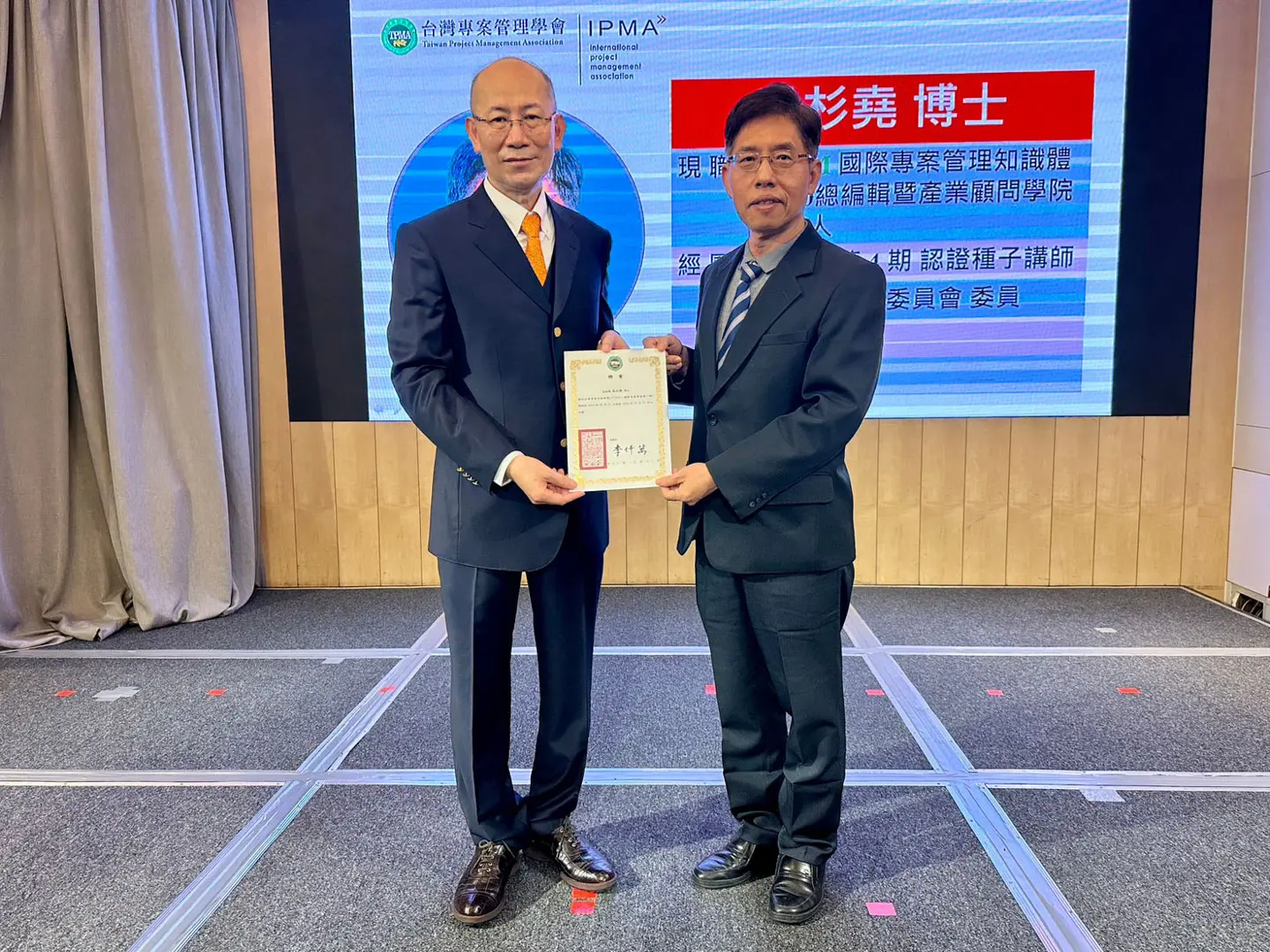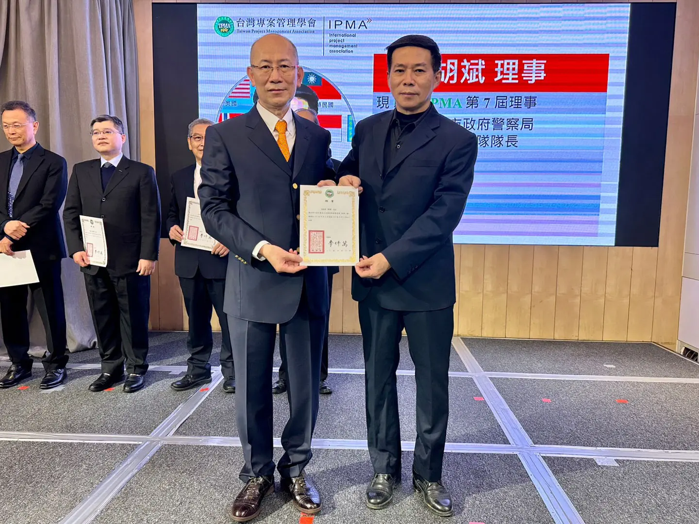 2022年7月20日 TPMA 理事長李仟萬 先生親自授予 IPMA Level A 級證書予許光華校長,並與學會同仁合影留念。
